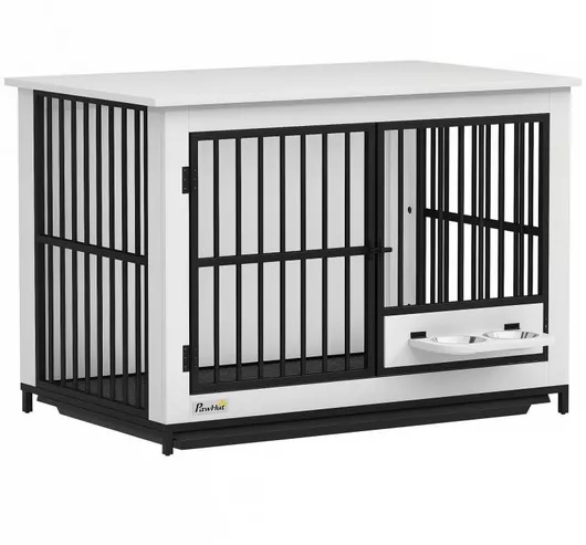 Pawhut Μεγάλο Κλουβί Σκύλου με Εύκολη Πρόσβαση, Κλειδωμένη Πόρτα, Περιστρεφόμενη Βάση & Μπολ, για Μικρούς & Μεγάλους Σκύλους, Λευκό