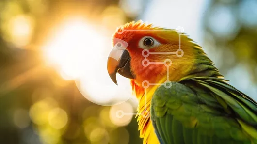 Intra Συλλεκτικό Ξύλινο Παζλ Plywood 4mm - Πολύχρωμος παπαγάλος με ανοιχτό ράμφος μπροστά στον ήλιο Σε Ξύλινο Κουτί - Διαστάσεις: 10x10 cm – 25 κομμάτια