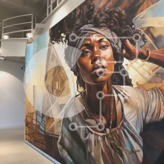 Intra Συλλεκτικό Ξύλινο Παζλ Plywood 4mm - Κομψή γυναίκα με Afro που στέκεται μπροστά από την πολύχρωμη τοιχογραφία γκράφιτι Σε Ξύλινο Κουτί - Διαστάσεις Puzzle: 10x10 cm – 25 κομμάτια