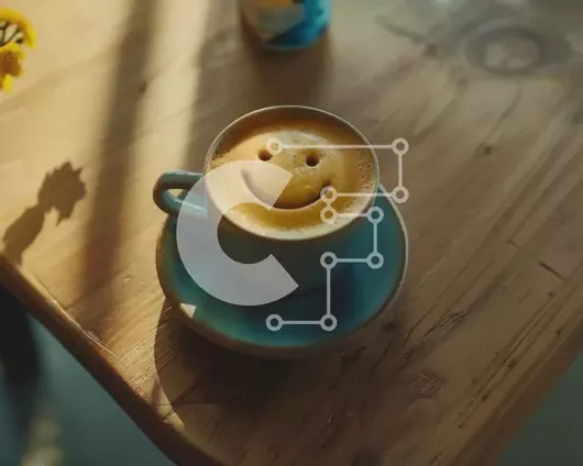 Intra Συλλεκτικό Ξύλινο Παζλ Plywood 4mm - Φλιτζάνι καφέ και πιατάκι με χαμογελαστό πρόσωπο σε ξύλινο τραπέζι με λουλούδια και χυμό πορτοκαλιού Σε Ξύλινο Κουτί - Διαστάσεις: 10x10 cm – 25 κομμάτια