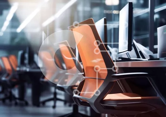 Intra Συλλεκτικό Ξύλινο Παζλ Plywood 4mm - Σύγχρονος χώρος εργασίας γραφείου με πορτοκαλί καρέκλες και οθόνες υπολογιστών Σε Ξύλινο Κουτί - Διαστάσεις Puzzle: 10x10 cm – 25 κομμάτια