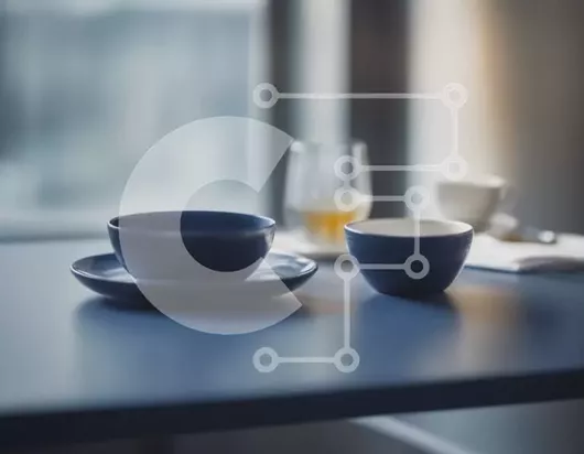 Intra Συλλεκτικό Ξύλινο Παζλ Plywood 4mm - Μπλε φλιτζάνι και πιατάκι στο τραπέζι με θέα στον ορίζοντα της πόλης Σε Ξύλινο Κουτί - Διαστάσεις Puzzle: 10x10 cm – 25 κομμάτια