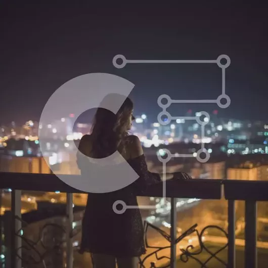 Intra Συλλεκτικό Ξύλινο Παζλ Plywood 4mm - Εκπληκτική θέα της πόλης τη νύχτα από το μπαλκόνι με τη γυναίκα με το μαύρο φόρεμα Σε Ξύλινο Κουτί - Διαστάσεις Puzzle: 10x10 cm – 25 κομμάτια