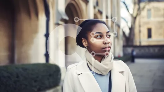 Intra Συλλεκτικό Ξύλινο Παζλ Plywood 4mm - Όμορφη νεαρή γυναίκα με λευκό παλτό που στέκεται στο πεζοδρόμιο μπροστά από το πέτρινο κτίριο Σε Ξύλινο Κουτί - Διαστάσεις Puzzle: 10x10 cm – 25 κομμάτια